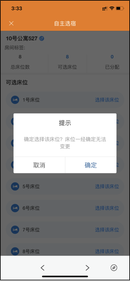 第三步:点击想要选择的宿舍,即可选择床位,并可看到该宿舍已入住人员,点击选择的床位后将会弹出确认提示,确认是否选择该床位,本系统床位选择后将不可更改。