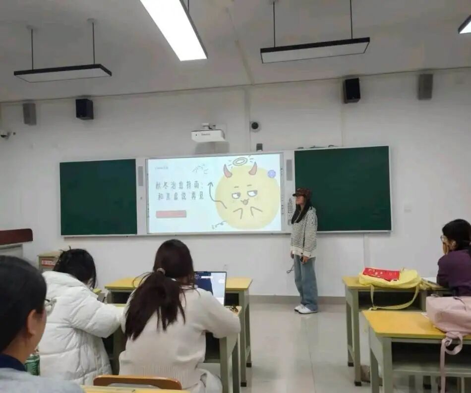 班会伊始,心理委员结合秋冬季节气候特征,向同学们科普了“季节性情绪波动”的成因与表现,明确适度焦虑是人体的“情绪预警信号”,属于正常心理反应,引导大家以平和心态正视该情绪。随后,主讲人重点分享正念放松法等实用技巧,通过现场示范与分步讲解,帮助同学们快速掌握情绪调节方法。此外,心理委员还强调了班级成员间相互关心、主动倾听的重要性,鼓励大家在困境中彼此支持,共同营造支持性集体氛围。