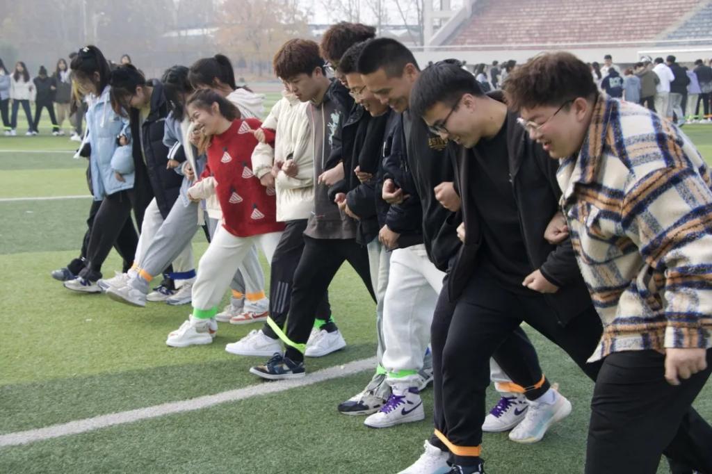 绑腿跑游戏极其考验一个团队的配合与默契。绑在一起的不仅是同学们的脚踝,更是同学们共进退的协同精神。当整齐嘹亮的口号声响彻操场,同学们从一开始的手忙脚乱变成最后一致的步伐,体现着每个团队逐渐增强的向心力。