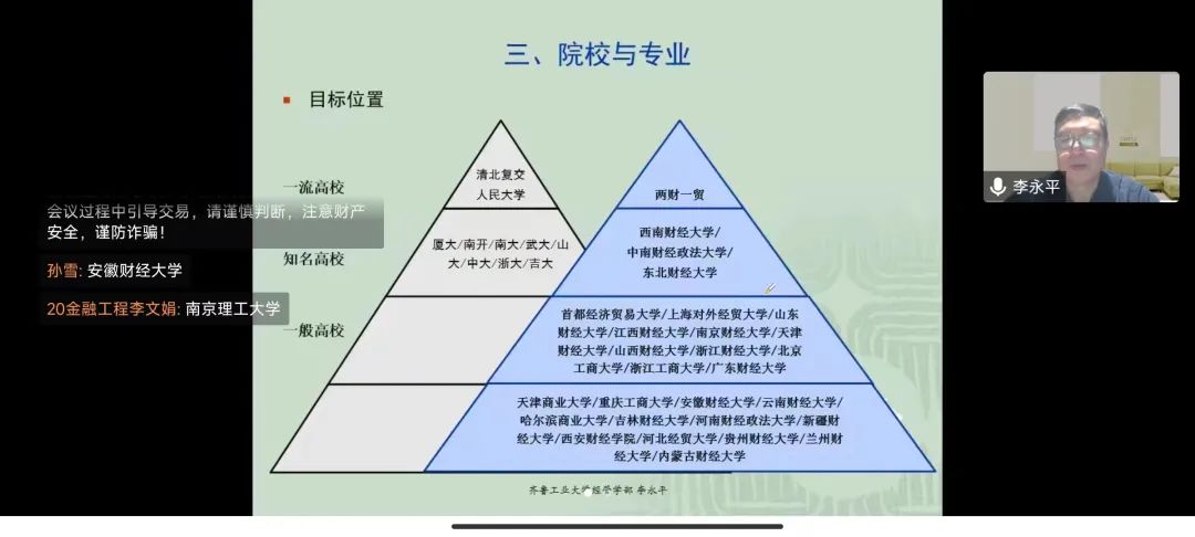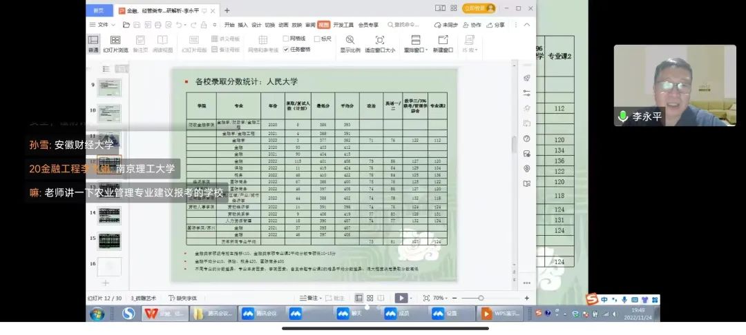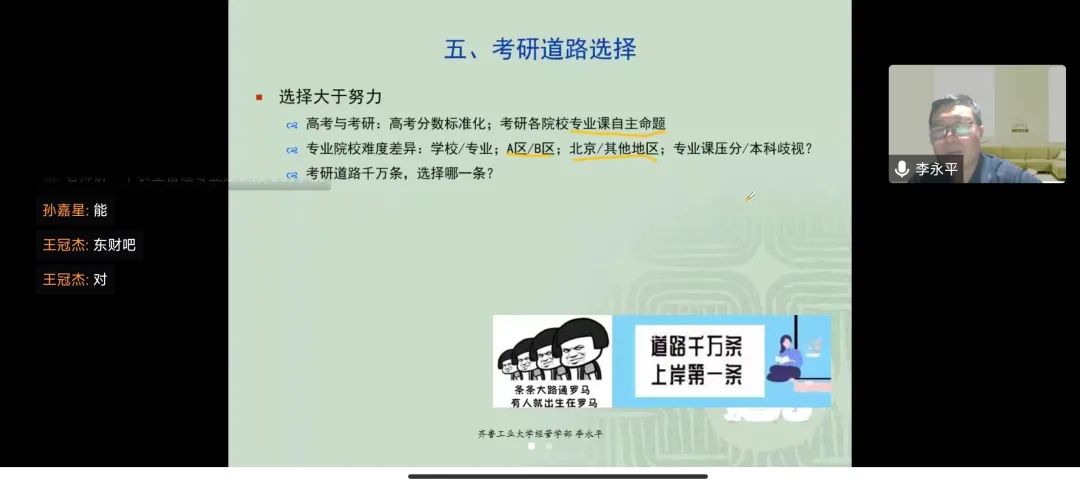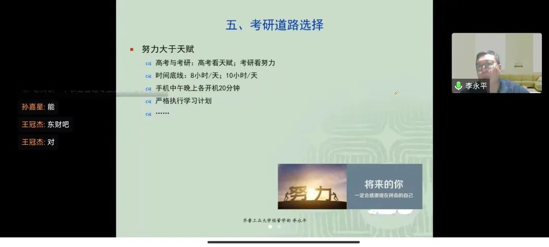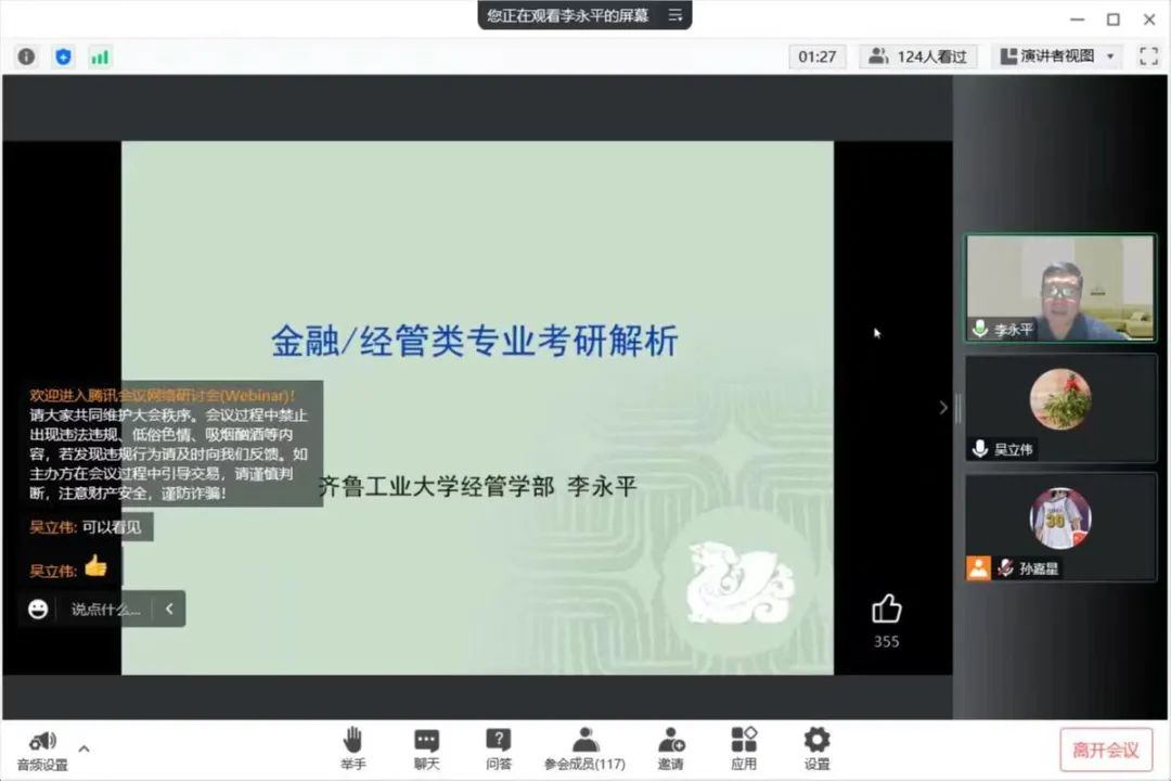 为进一步加深我院学生对金融与经管类专业的了解,确立相应的考研目标,11月24日晚上7点yl9193永利集团于线上开展专业考研解析讲座。我院有幸邀请到齐鲁工业大学金融学院的李永平教授,本次会议由党委副书记吴立伟主持,我院2020级本科班和2022级专升本班的同学参加此次讲座。
