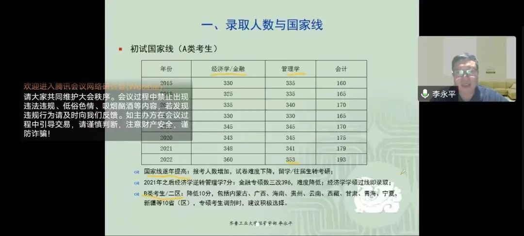 会议伊始,李永平教授从考研形势变化、学硕与专硕的区别及考试相关科目、金融与经管类专业情况等多方面进行分析,讲解了录取人数与国家线、学硕与专硕、院校与专业、上线与录取、考研道路选择五大部分。根据不同高校的考研门槛,为同学们提供了多样方案,帮助同学们多层次、多维度的了解近些年的考研情况。