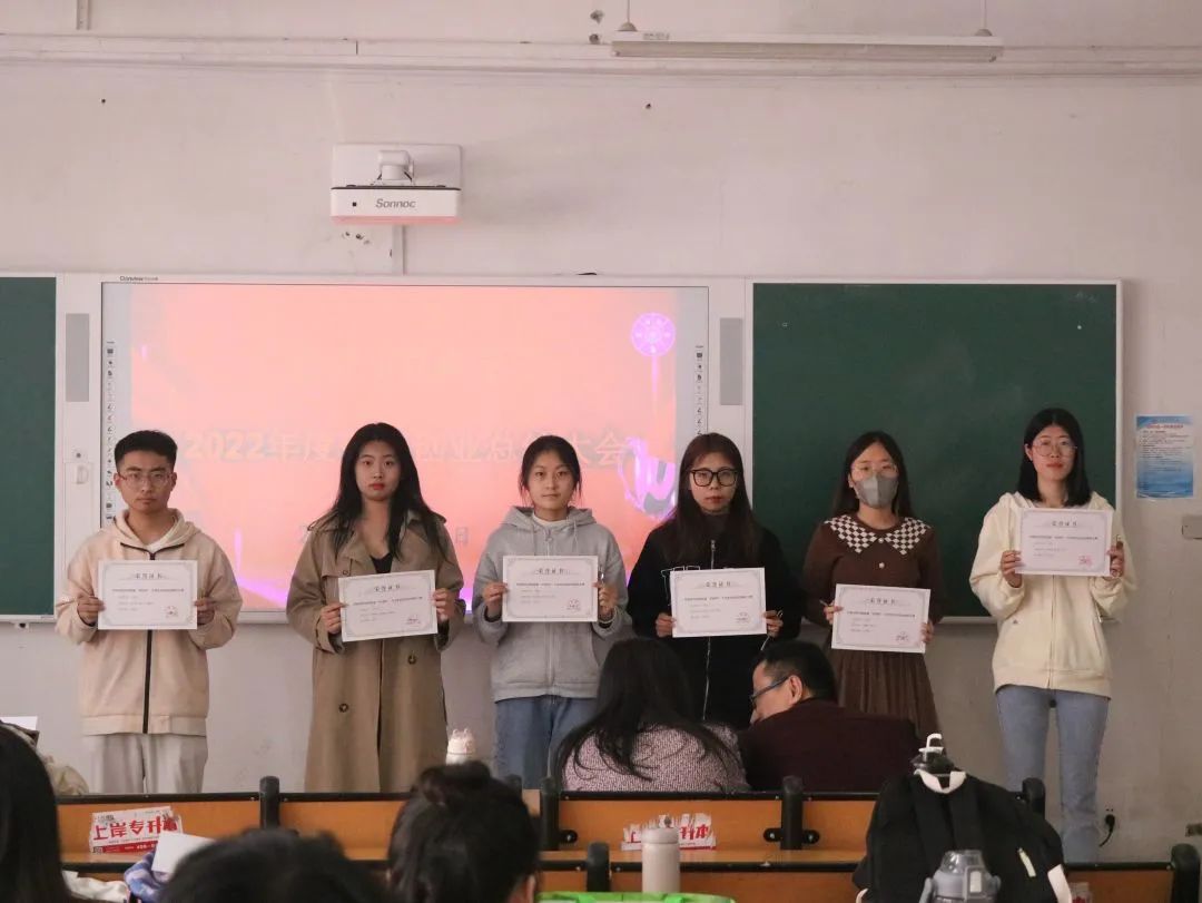 会议伊始,由学生代表宣读获奖名单,各位老师上台为获奖团队代表进行颁奖。随后,优秀参赛团队代表以线上线下相结合的方式,从自身角度出发,对各类创新创业大赛进行了经验分享。优秀参赛代表们表示在比赛中我们需要加强学习交流,虚心向老师请教,增强团队意识,保持良好的心态和冷静的头脑。从平时着手,做好策划与模拟,在接下来的挑战中,才能事半功倍,以一个积极向上的姿态迎接挑战。