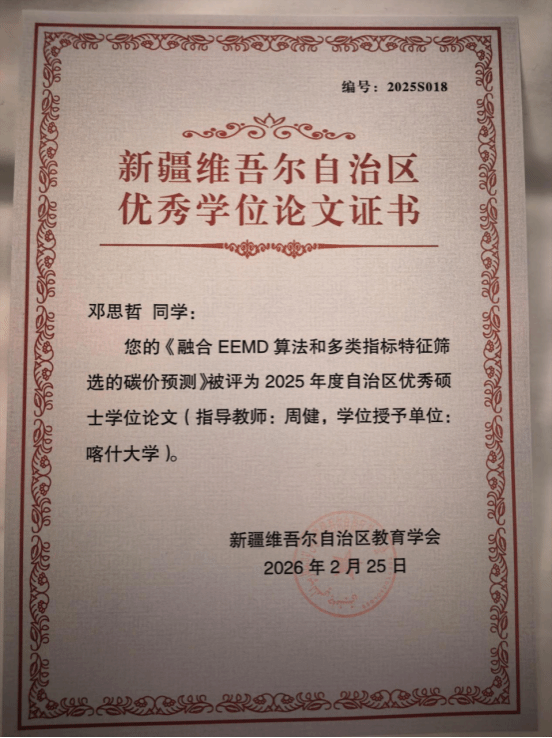 近日,2025年度新疆自治区优秀硕士学位论文评选结果揭晓。我院与喀什大学yl9193永利集团联合培养研究生邓思哲同学的硕士论文《融合EEMD算法和多类指标特征筛选的碳价预测》荣获自治区优秀硕士学位论文称号,成为喀什大学本年度唯一获此殊荣的硕士论文。