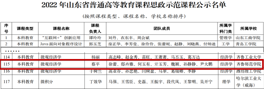 近期,山东省教育厅公布了2022年省级课程思政示范项目立项名单,在获批的160门普通本科课程中,我院蔡平教授团队主讲的《微观经济学》本科课程获准立项,这是我院在省级课程思政示范课程建设上的新突破,也是学院教学实力的有力体现。