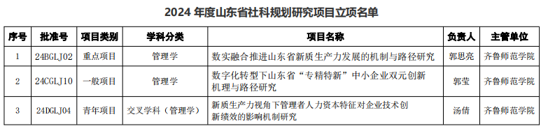 8月2日,山东省哲学社会科学工作办公室公示了2024年国家社会科学基金年度项目立项名单,我院3项项目获批立项,其中重点项目1项,一般项目1项,青年项目1项。