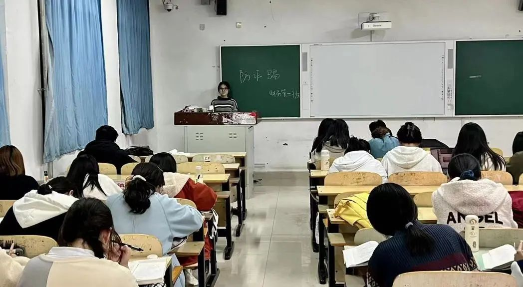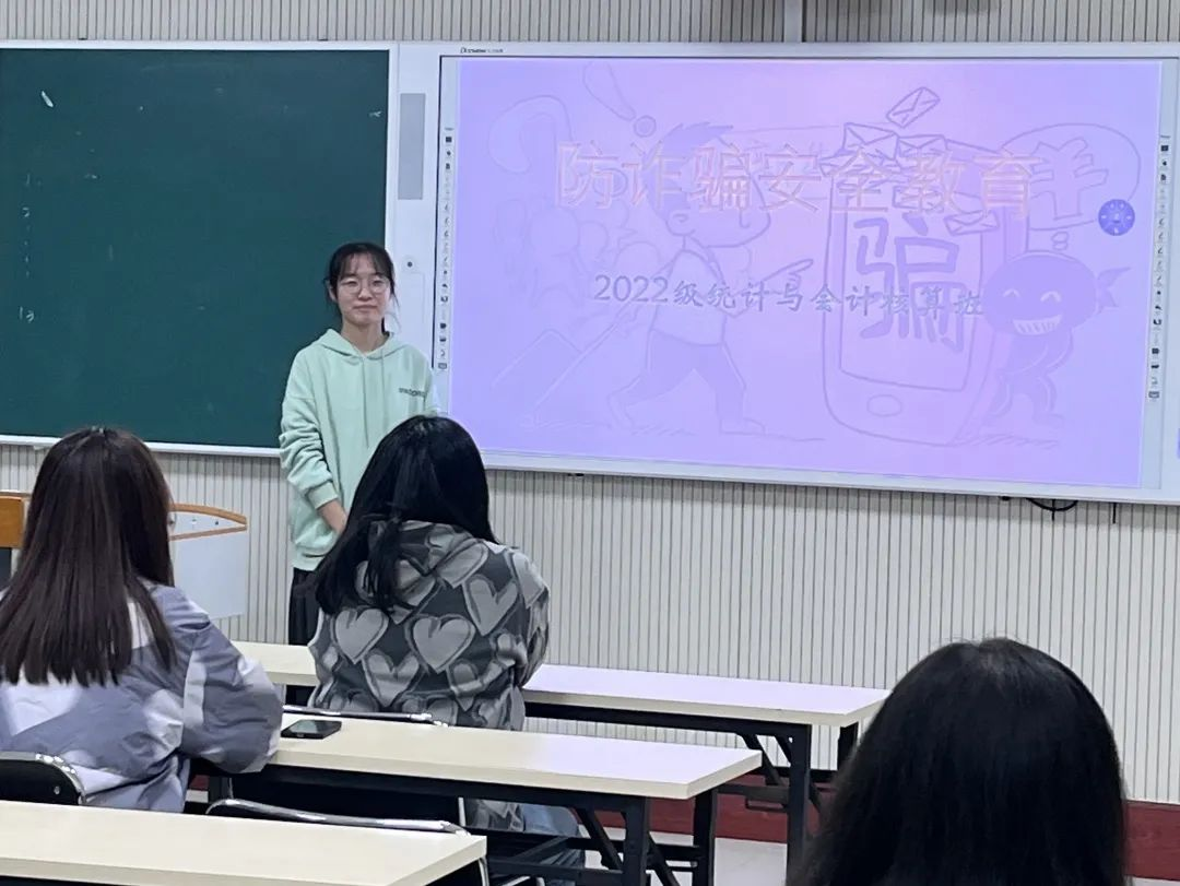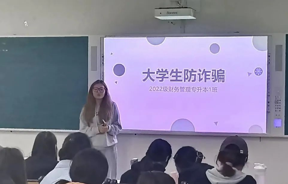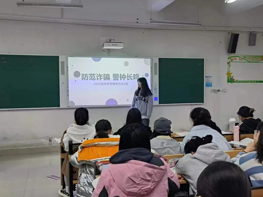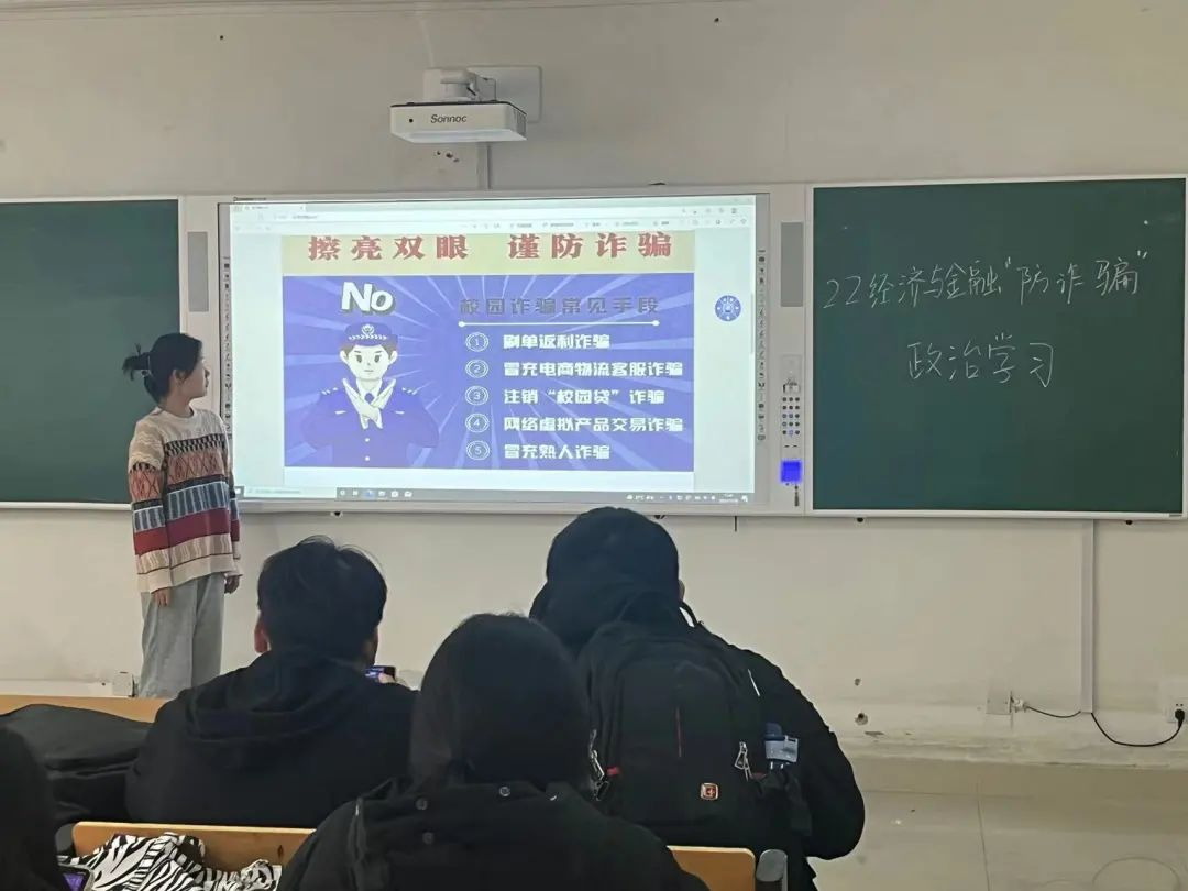 为提高同学们的安全意识,筑牢校园安全防线,11月10日,我院在一教各班自习教室中,采用线上线下相结合的方式,进行了以“防诈骗”为主题的政治学习。