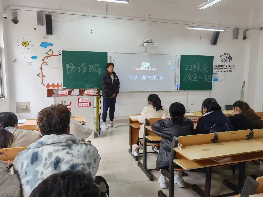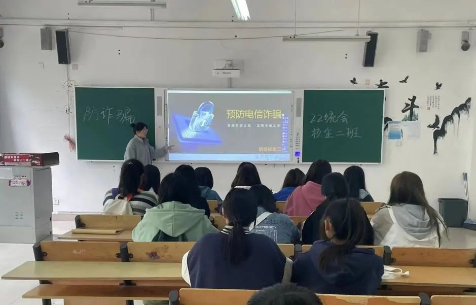 班会伊始,主讲人简单介绍了什么是电信诈骗以及电信诈骗的常见形式,电信诈骗是近年来围绕在生活中比较突出的侵财犯罪,包括电话诈骗、网络诈骗、纸质媒介诈骗等,是犯罪分子利用日益先进的通讯手段、银行支付渠道以及互联网技术,向不特定多数人实施的诈骗。