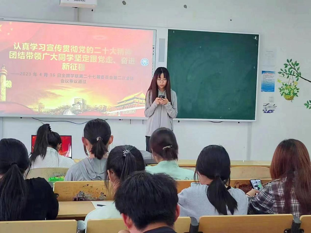 首先,主持人为大家明确了此次学习分享会的目的和主题,向大家具体介绍以“认真学习贯彻党的二十大精神,团结带领广大同学坚定跟党走,奋进新征程”为主题的学习分享,简述了全国学联学生会的作用、二十大以来的工作及下一步改革建设的任务。以刀刃向内的勇气,纵深推进学联学生会组织改革聚焦政治引领,把学习宣传贯彻党的二十大精神贯穿始终,聚焦“形神兼备”,把学联学生会组织改革进行到底,聚焦主责主业,把服务同学和服务大局落到实处。