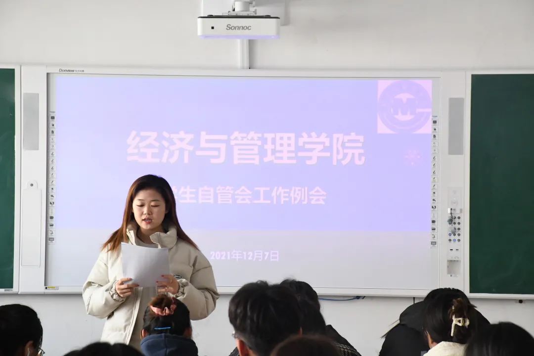 最后,自管会主席团成员郭宝鹏强调了值班室卫生问题以及各班级文艺晚会时间问题,希望各部门协调好工作,加强学院内部联系,更好的服务同学们。