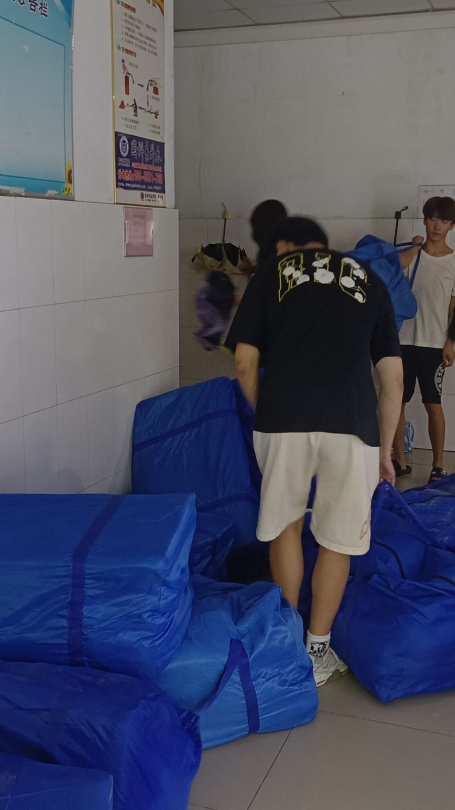 当载有卧具的车辆进入校园,志愿者们即刻展开行动。他们明确了各自的职责,部分人员负责引领方向,其余成员则承担搬运工作。他们谨慎细致地处理每一件卧具,以防任何损伤。尽管汗水浸湿了他们的衣装,但他们并未有任何怨言,因为他们深知,自己的辛劳将为新生们带来极大的便利。