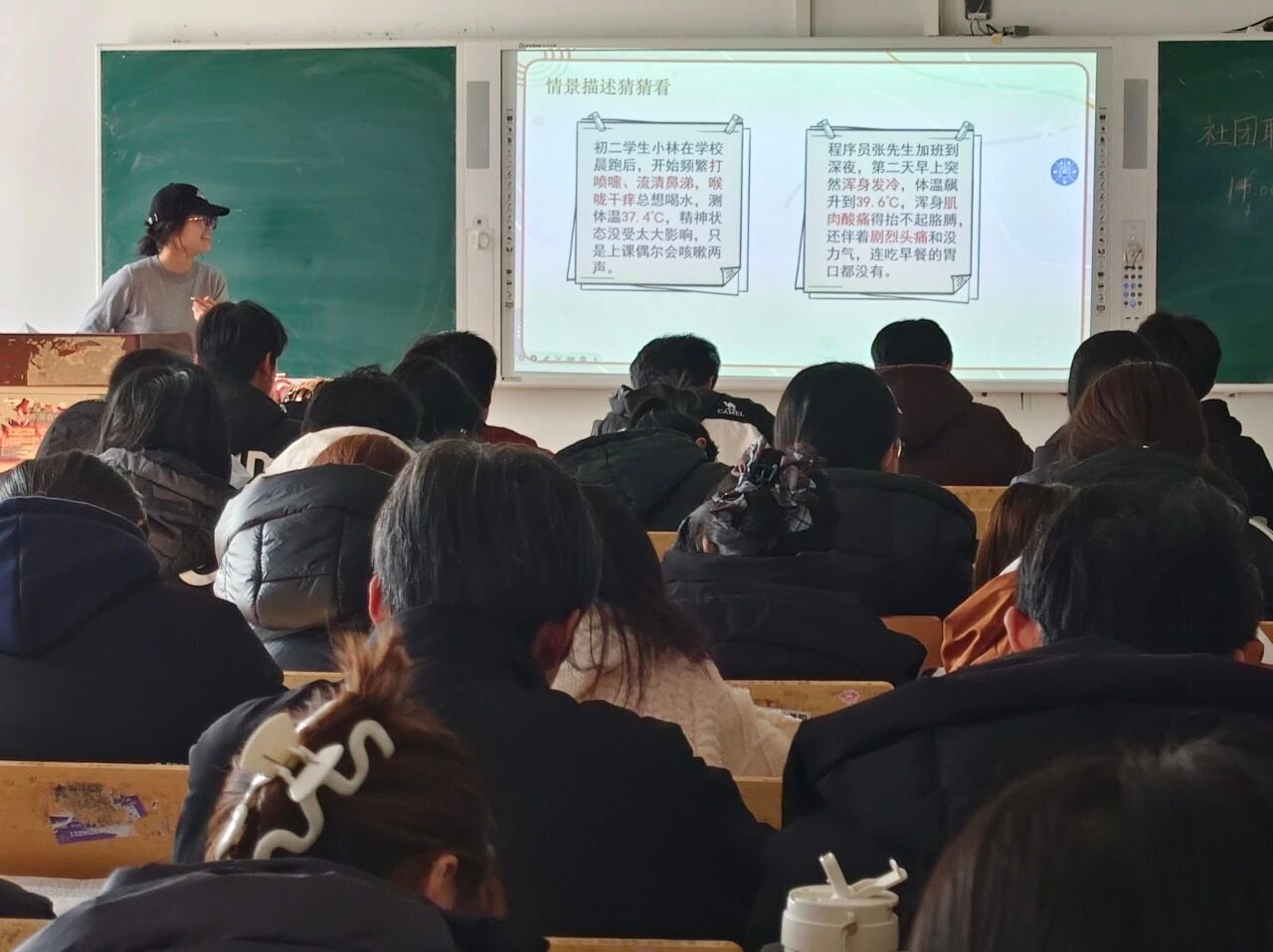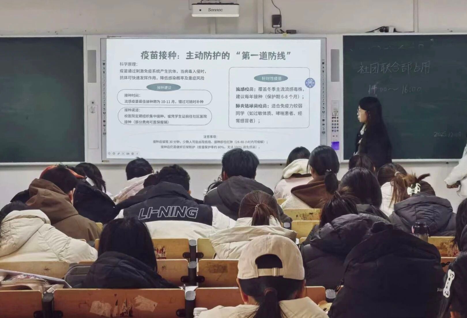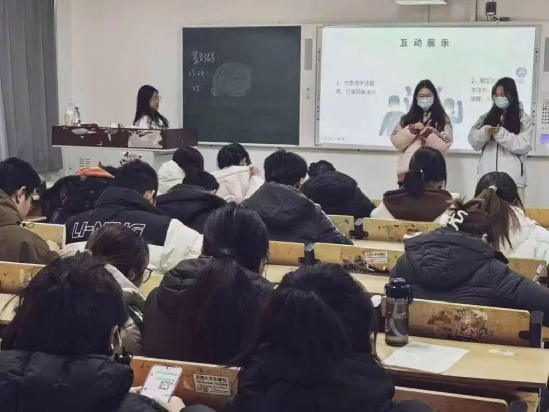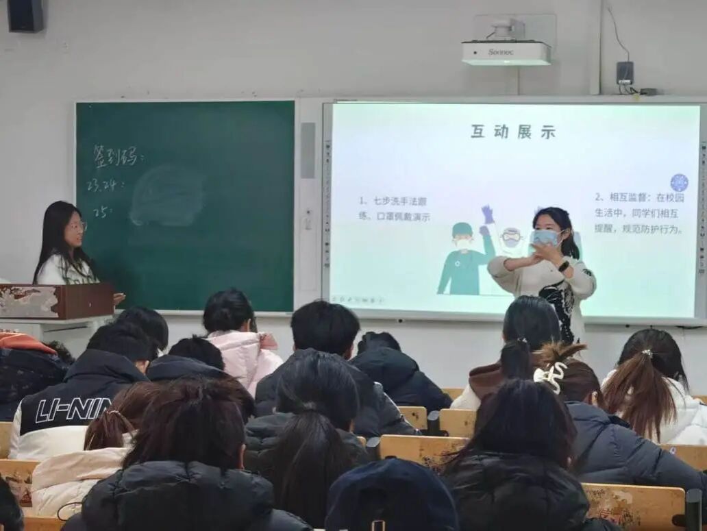 此次活动在理论宣讲环节,宣讲员张今同学系统讲解常见病原体、传播途径、高发原因及症状特点,针对大学生群体生活作息特点分析感染易发性,用典型案例说明冬季传染病的传播速率与防控紧迫性,同时开展“健康侦察兵”症状识别抢答互动,以趣味形式强化知识吸收,让同学们对冬季传染病形成全面认知。在实践宣讲环节,宣讲员邵奕涵和苏鑫兆同学详细解读了疫苗接种、环境通风、增强免疫力等核心预防措施,结合宿舍、教室等校园高频场景演示防护操作要点,手把手指导口罩正确佩戴、手部规范消毒等实用技巧,助力同学们将防护知识转化为日常践行的健康防护本领。