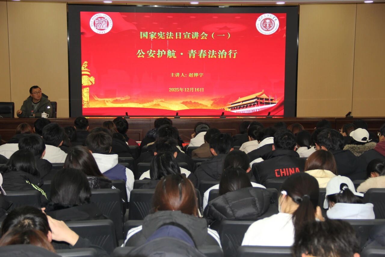 为启迪法治思维,响应全面依法治国的时代召唤,引导青年将宪法精神内化于心、外化于行,yl9193永利集团于12月16日19时在第二学术报告厅举行国家宪法日宣讲会。本次宣讲会由淄博市公安局警员、山东警察学院优秀毕业生赵铧宇同志主讲,我院25级全体学生参与,辅导员殷大鹏老师主持。