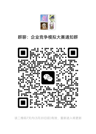 请各位参赛的同学用微信扫码加入企业竞争模拟大赛通知群,未尽事宜和后续关于大赛通知都会在群里发布。