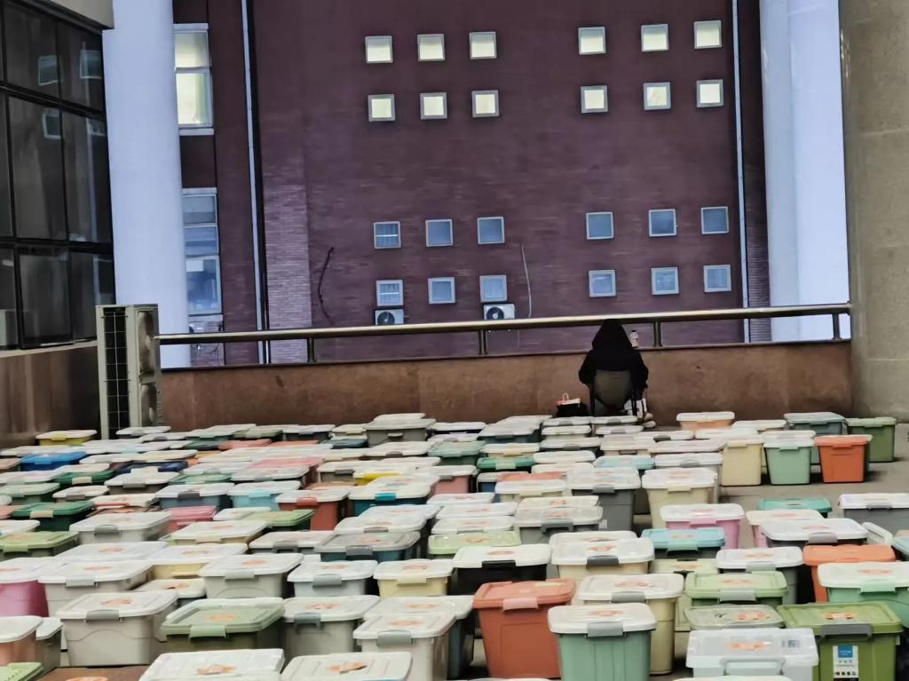 在这满是收纳箱的场地上,有个女孩静静坐着学习。那些五彩箱子似是梦想的拼图,散落四周。她身披黑色外套,将自己包裹在专注的世界里。背后的建筑沉默矗立,像知识的堡垒。她未被周遭繁杂干扰,一心沉浸于书本。每一次低头思索,每一回提笔书写,都是在为梦想添砖加瓦。学习之路或许漫长孤寂,可她以坚韧为帆,在知识海洋里勇毅前行。这一方小天地,是她的战场,收纳箱见证她的努力,她在知识的宝藏中探寻,用汗水与专注,勾勒属于自己的未来蓝图。