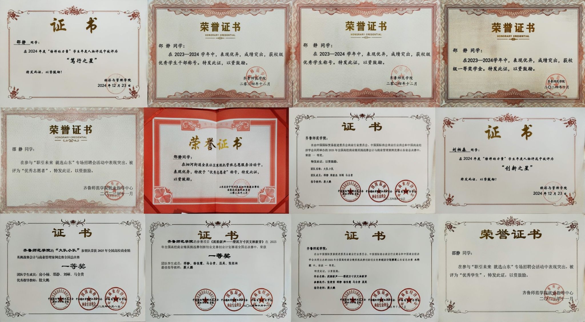 曾获“中国国际大学生创新大赛省级金奖”、“全国高校商业精英挑战赛会计与商业管理案例竞赛国家级一等奖”、“正大杯第十五届全国大学生市场调查与分析大赛省级一等奖”、“第十五届全国大学生电子商务‘创新、创意及创业’挑战赛省级二等奖”等30余项荣誉。在学业上坚守“一分耕耘,一分收获”的信条,学习成绩及综合测评成绩连续两学年位列专业第一。