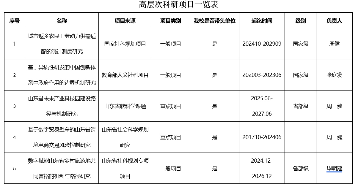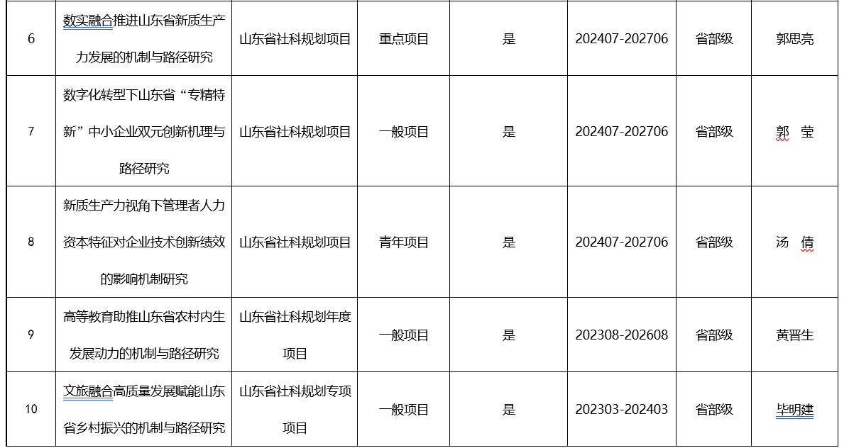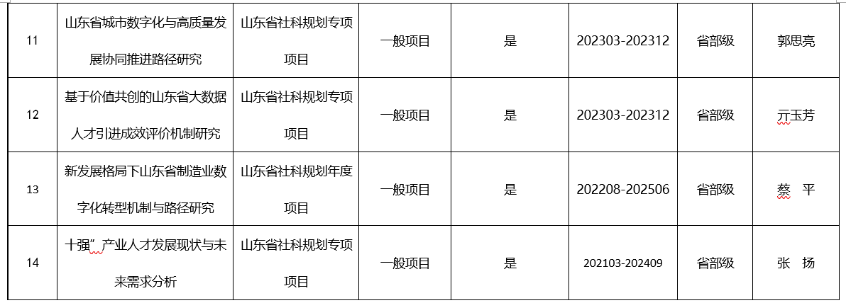 科学研究是学科建设的基础,学科建设为科学研究提供了广阔的空间。在学科建设过程中,研究团队充分发挥各学科专业优势,在教学实践中不断创新发展,取得了一定的研究成果。从2020年至今,学科团队共立项或结项省部级以上科研项目13项,其中国家社科规划项目1项,教育部人文社科项目1项,山东省社科规划重点课题2项,山东省社科规划一般课题9项,山东省软科学课题2项。